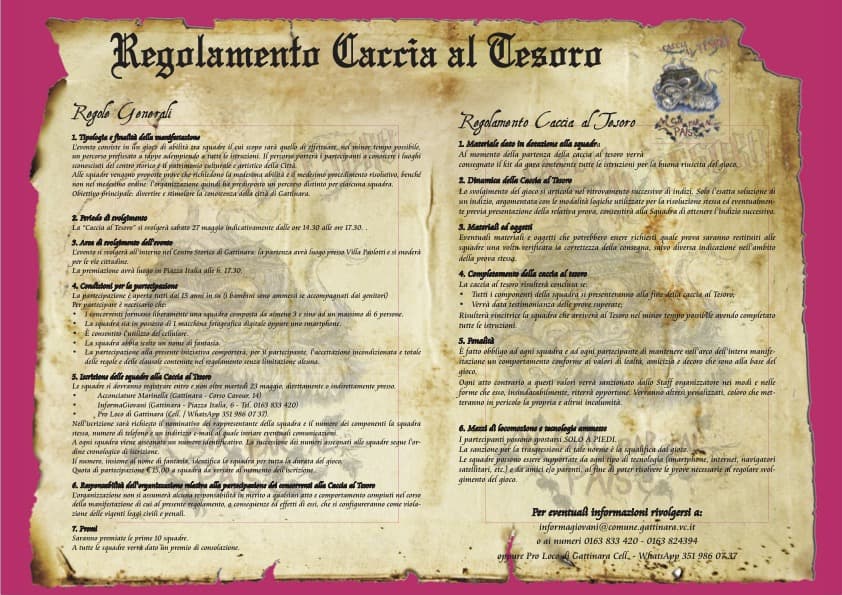 Quest'anno il tema della caccia al tesoro è Gattinara Segreta. Ci sono degli angoli di Gattinara che in pochi conoscono e che custodiscono scampoli di storia troppo spesso dimenticata.