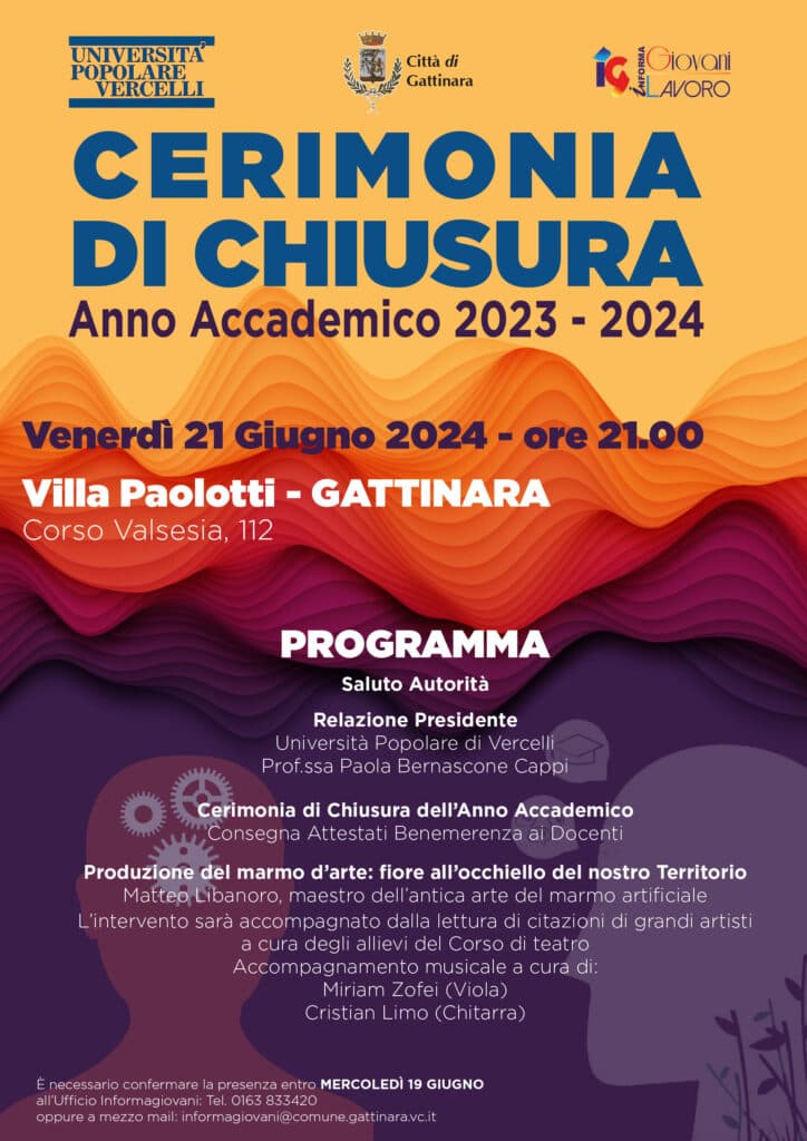 Si terrà venerdì 21 giugno, alle ore 21.00, nella suggestiva cornice di Villa Paolotti a Gattinara la tradizionale cerimonia di chiusura dell’Anno Accademico 2023 – 2024 dell’Università Popolare di Vercelli.
